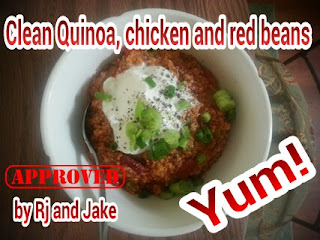 Saute chopped onions in a bit of olive oil for 2 min in a large skillet. Add packet of Sazon and crushed garlic. Saute 2 min more. Add can of beans and can of diced tomatoes. Simmer. Meanwhile cook quinoa according to directions on the bag in a separate pot. Shred chicken and add to simmering onion and bean mixture. Drain quinoa and add skillet mixture to quinoa in the empty pot. Add one can of tomatoe sauce. Heat through another 10 min on low.